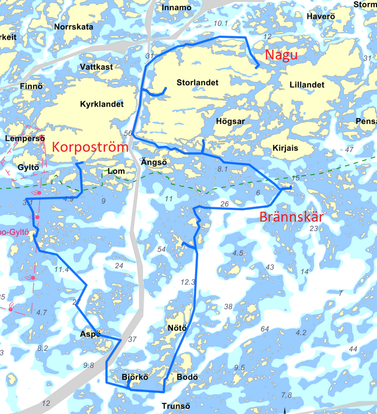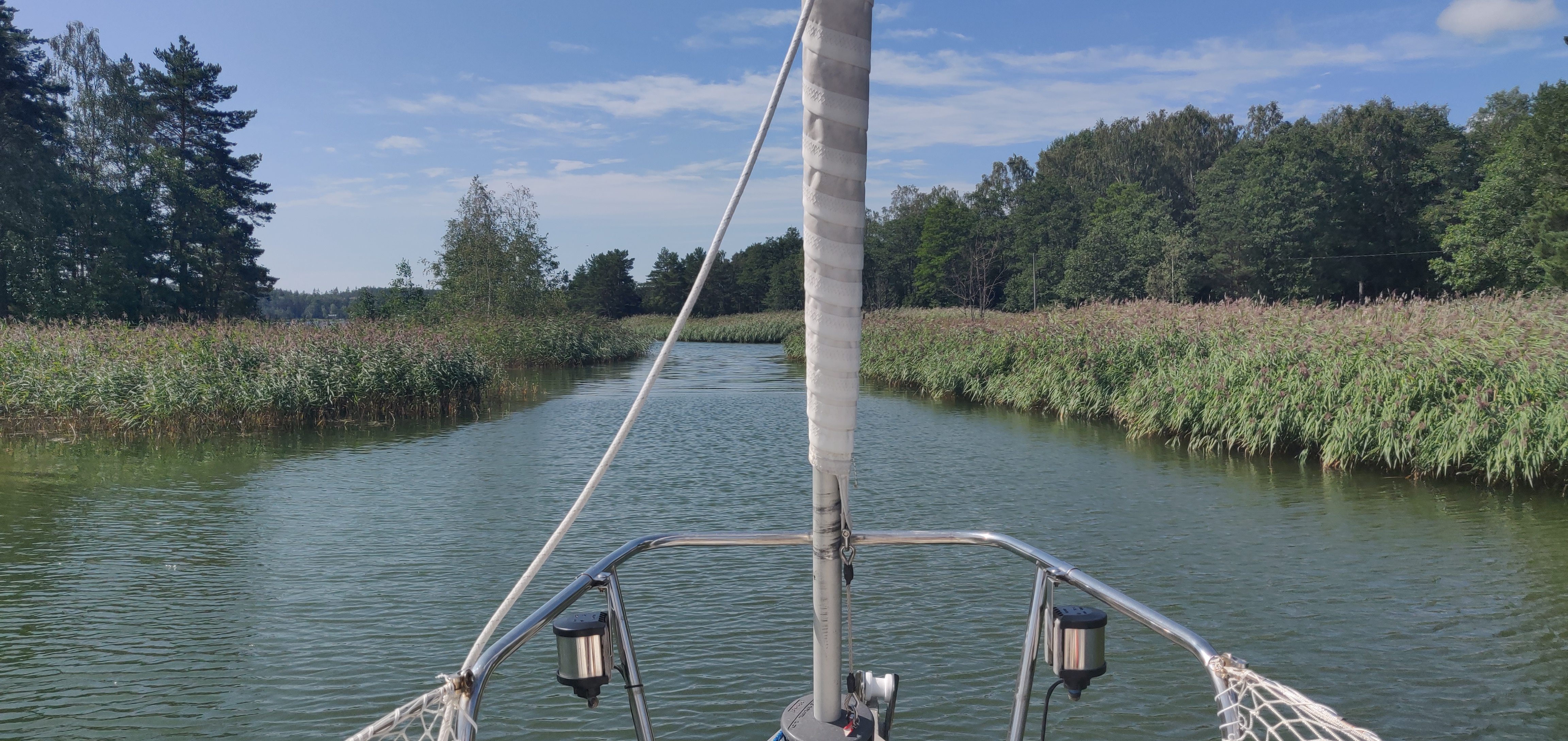 First we head for Nagu, but when Fredrik ‘optimizes the route to save some distance and go in more protected waters, it turns out that it would take us under a 14 meter bridge (we’re 16 meters to the top of the VHF antenna…). Some quick replanning and a phone call to the new guest harbour in Tackork and we have a new destination without obstacles. The route in to the Tackork harbor is extremely narrow, but once in it’s incredibly well protected, and can get the dogs walked, work done, and we lie safe over night.