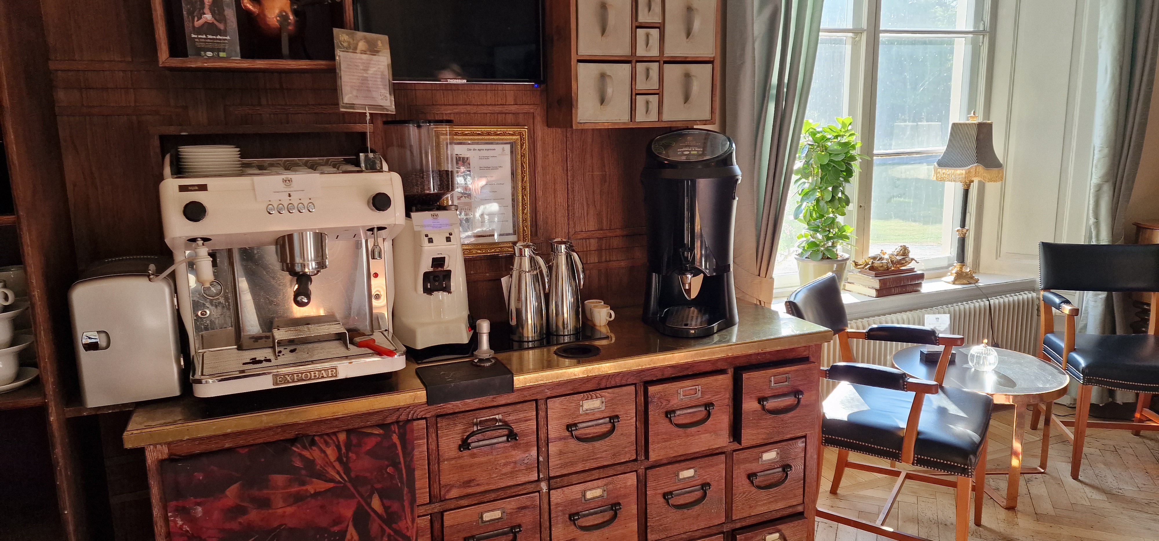 Den öppna kaffebaren intill receptionen var en trevlig överraskning och gav extra guldkant på vår slottsvistelse. Vi kunde göra riktigt gott kaffe på egen hand och sitta bekvämt i sköna stolar i en härlig miljö som kändes inredd som en retro pianobar.