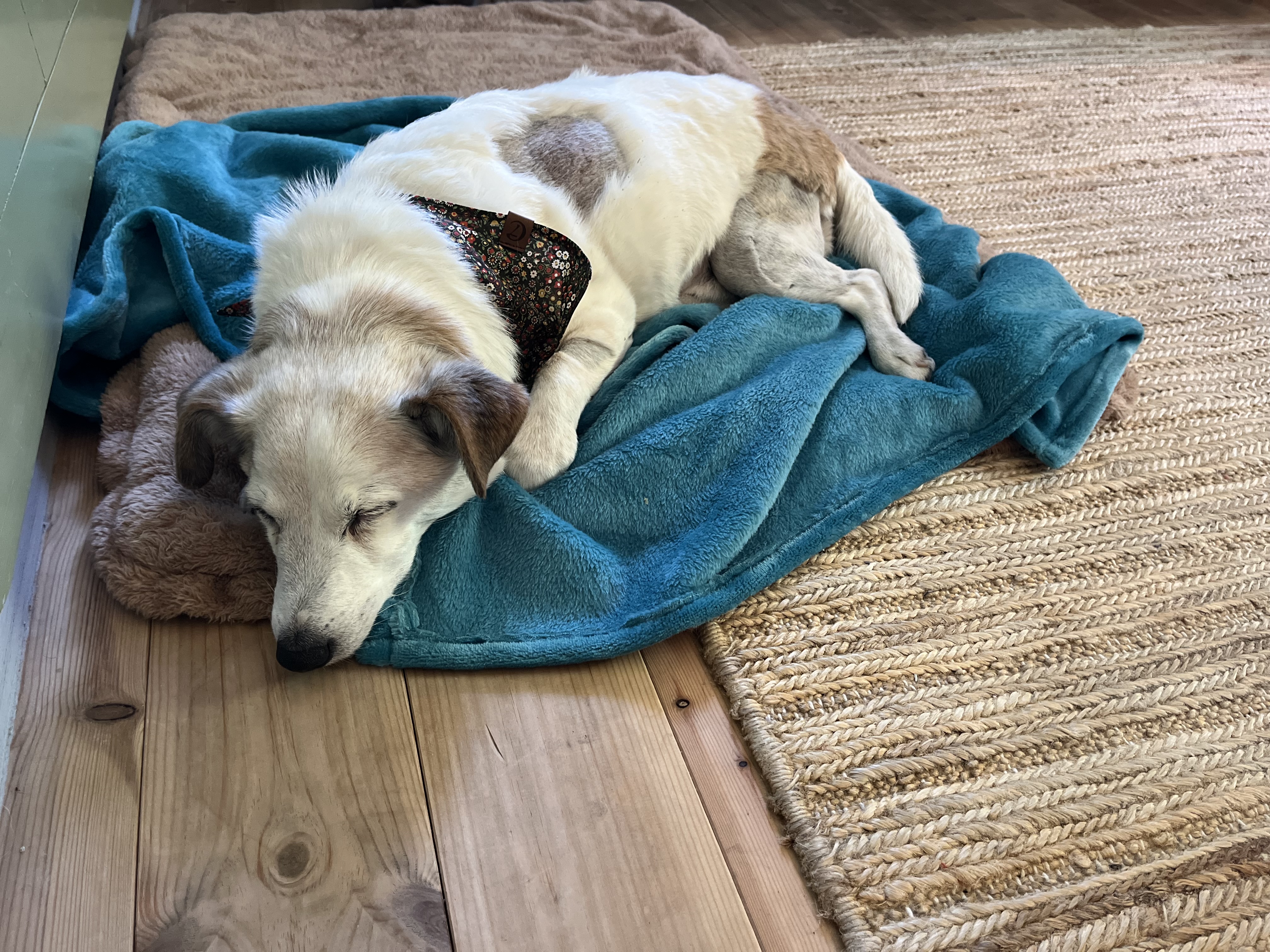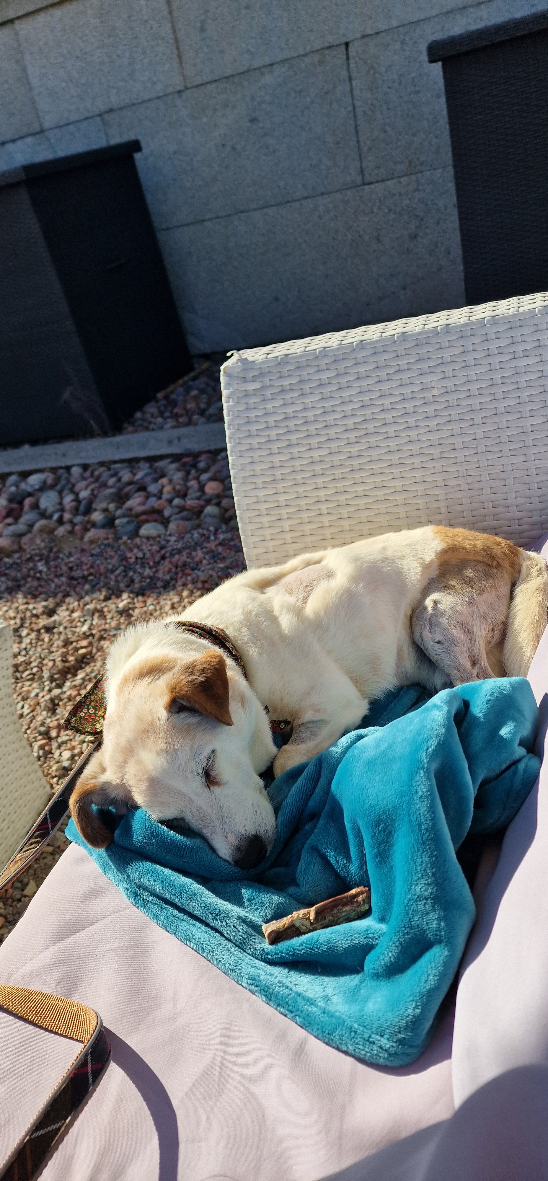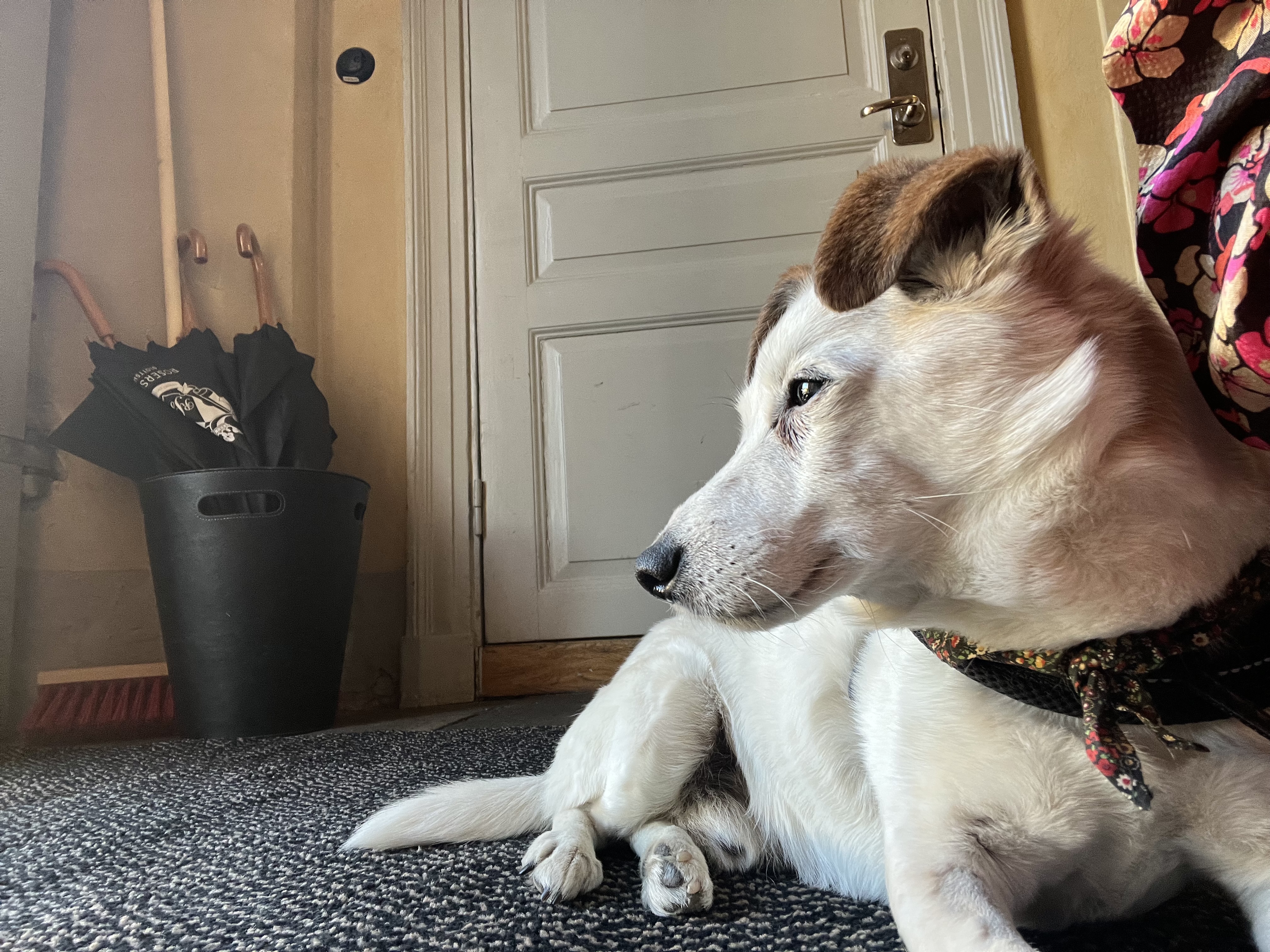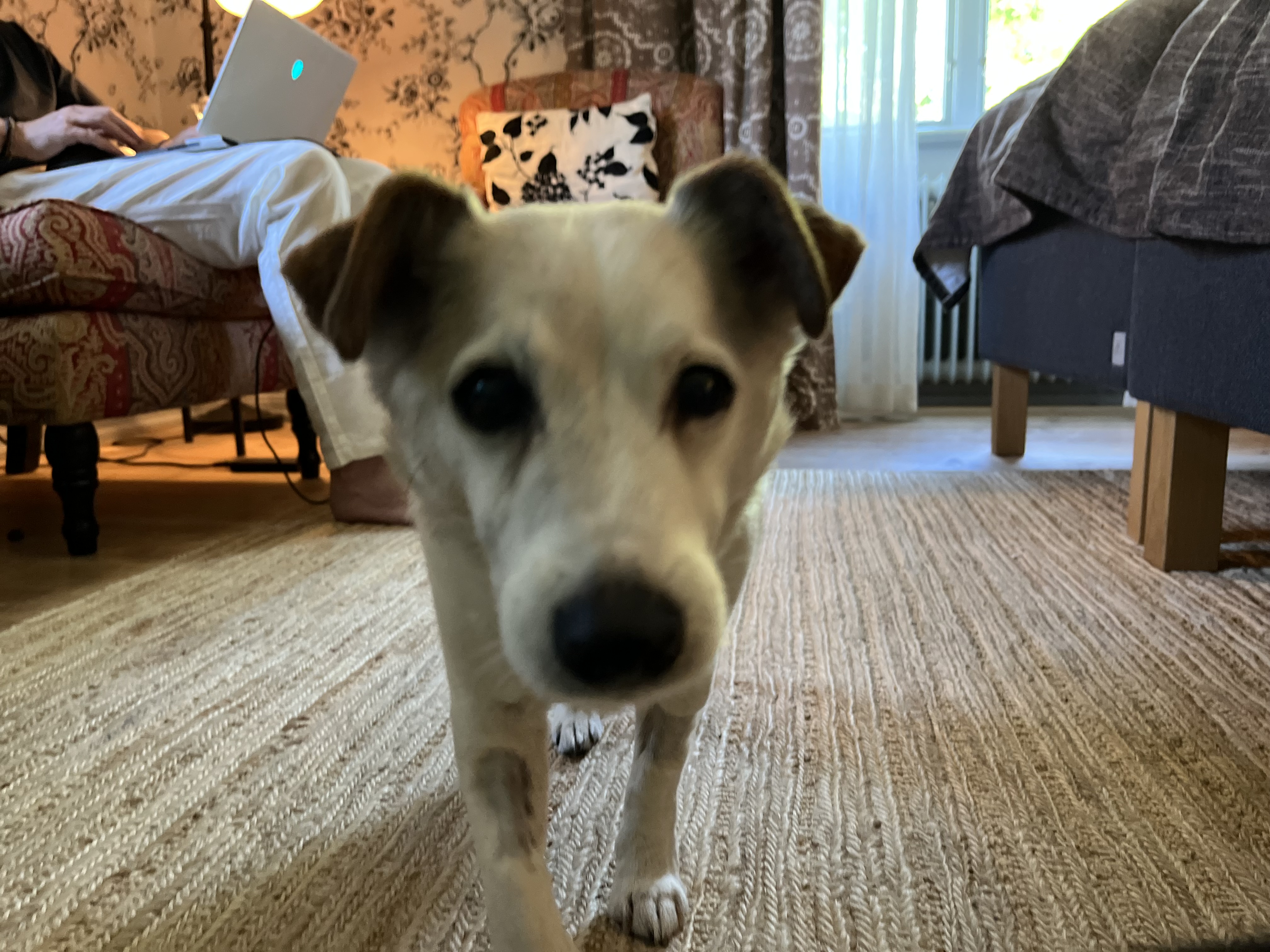 Gordon fick ju en lyxig hundgodispåse på rummet och då tog vi tillfället i akt att göra sökträning med godiset som en mental stimulans för att få honom att använda sitt nyopererade ben och glömma för en stund att det känns läskigt att gå med det och för att skapa en positiv upplevelse av rummet tidigt. Vi delade godiset i små små bitar och kastade upp bitarna i luften och sa “Godisregn”. Bitarna flög åt alla håll på golvet och Gordon blev genast intresserad. Sedan pekade vi ut en godis på golvet och sa “Sök” och det satte igång Gordons sökande. När han tagit sista biten sa vi “Slut” för att markera ett slut på sökträningen så att Gordon skulle släppa övningen och komma till ro. När övningen var slut fanns det inte en tillstymmelse av hundgodis kvar på golvet så godispåsen fick högsta betyg från en annars väldigt kräsen hund.