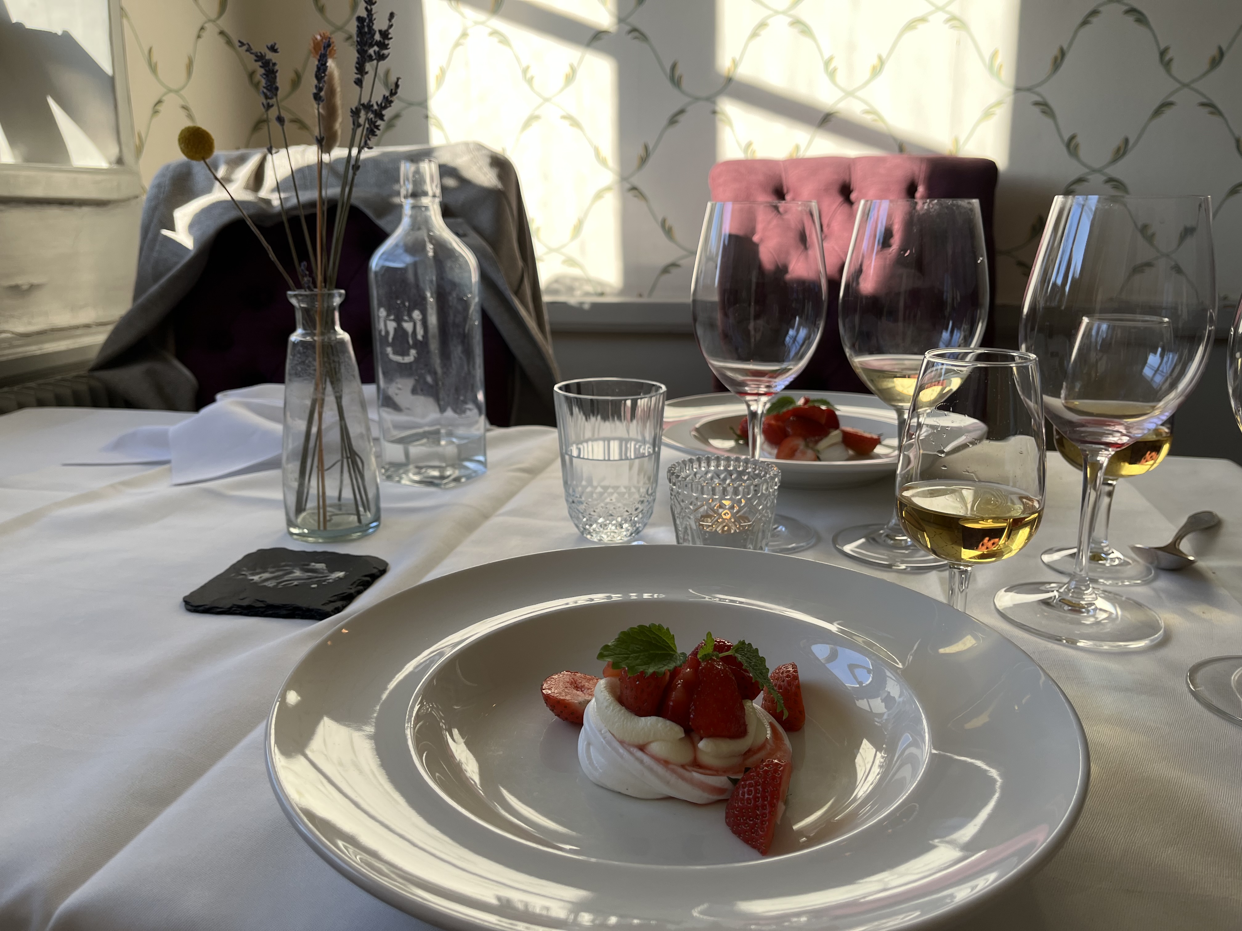 Vi hade bokat en trerättersmiddag och talade om att vi gärna ville ta med Gordon till matsalen under middagen i slottshotellets restaurang. Den underbara personalen hade bokat in oss i ett lugnt, avskilt rum och att det bara var lite separat från andra gäster gjorde att vi fick en väldigt lugn och stillsam middag vilket vi uppskattade jättemycket. Gordon kom snabbt till ro intill oss på sin filt hemifrån. Vi hade tagit med oss hundgodispåsen från rummet och gav honom lite när vi ätit klart som en belöning för att han varit så lugn och för att han inte tiggt under vår middag.