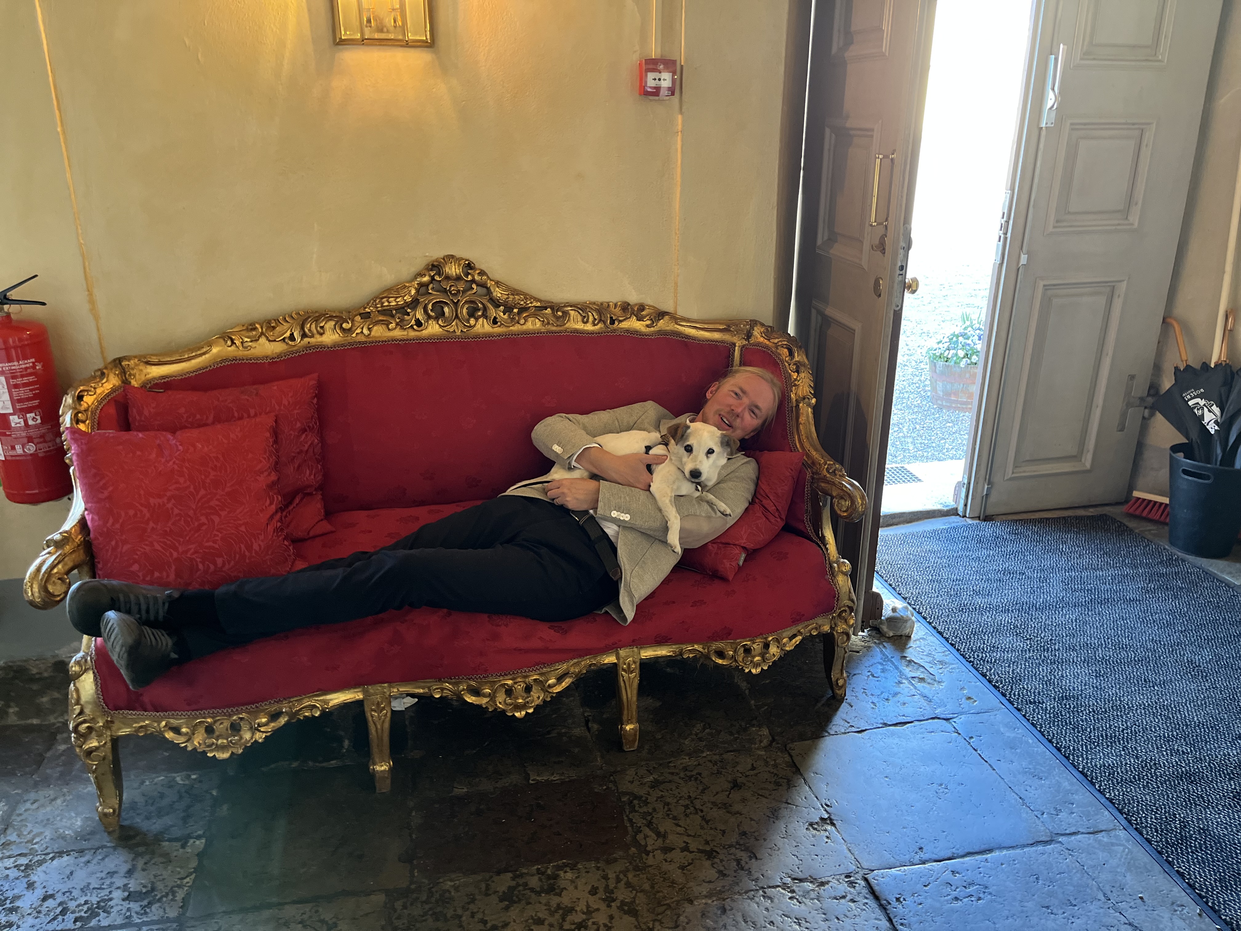 Frukosten var generös, fräsch och jättegod och vi valde att sitta i ett lugnt hörn med Gordon. Vi hade med oss hans hemmafilt och egna vattenskål och placerade honom i hörnan i skydd av oss båda så att han skulle känna sig trygg och kunna koppla av. Av allt gott de bjöd på uppskattade vi mest det riktigt varma kaffet, de goda minicroissanterna och all färsk skuren frukt. Även sådant som ofta känns varmhållet kändes nygjort till exempel stekt bacon och äggröra. De hade också ordnat så att man kunde göra fräscha våfflor på egen hand, men vi var för mätta för det. Men det såg riktigt gott ut! Det får bli nästa gång! Vi ser fram emot att återvända till den här miljön. Tack för en fantastisk och oförglömlig slottsupplevelse med Gordon! Det blir ett fint minne! ❤