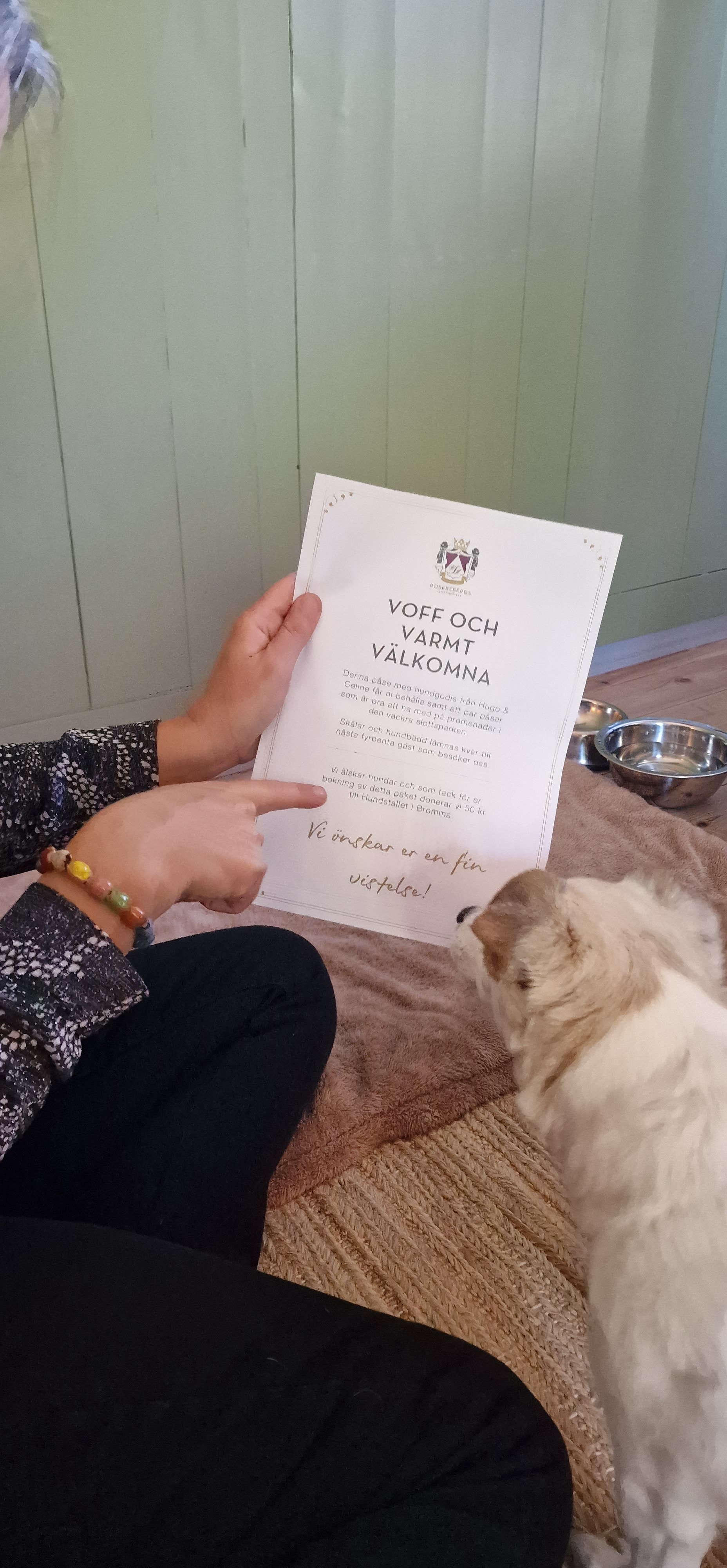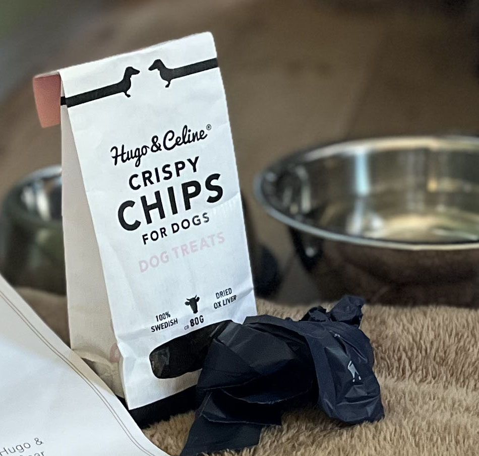 Vi hade valt till Best Friend Paketet vid bokningen för ett extra lyxigt välkomnande av Gordon. Han fick lyxigt hundgodis “Crispy Chips” från Hugo&Celine, hundbajspåsar och han fick låna en mysig mjuk hundbädd och en fräsch vatten- och matskål på rummet.