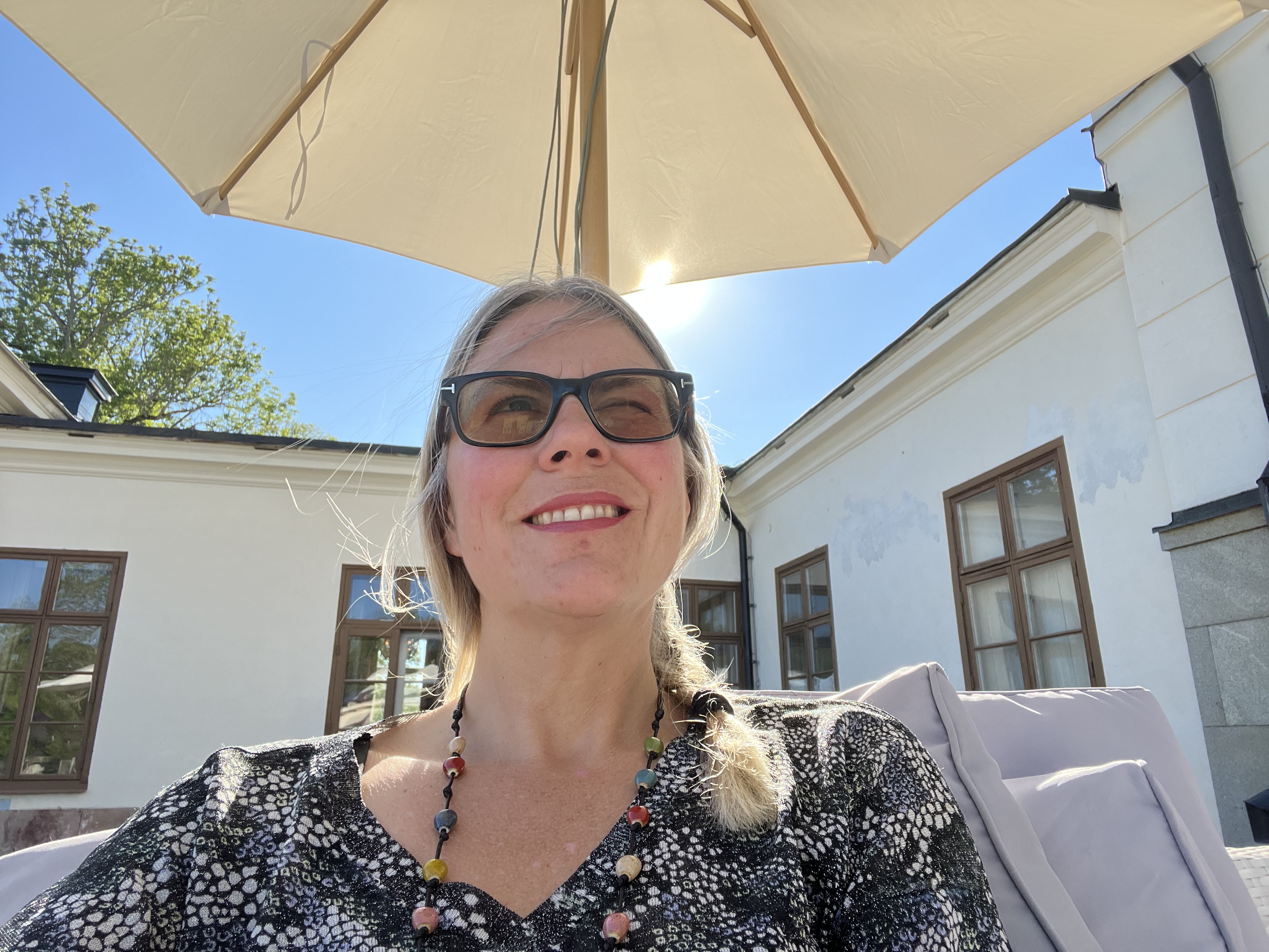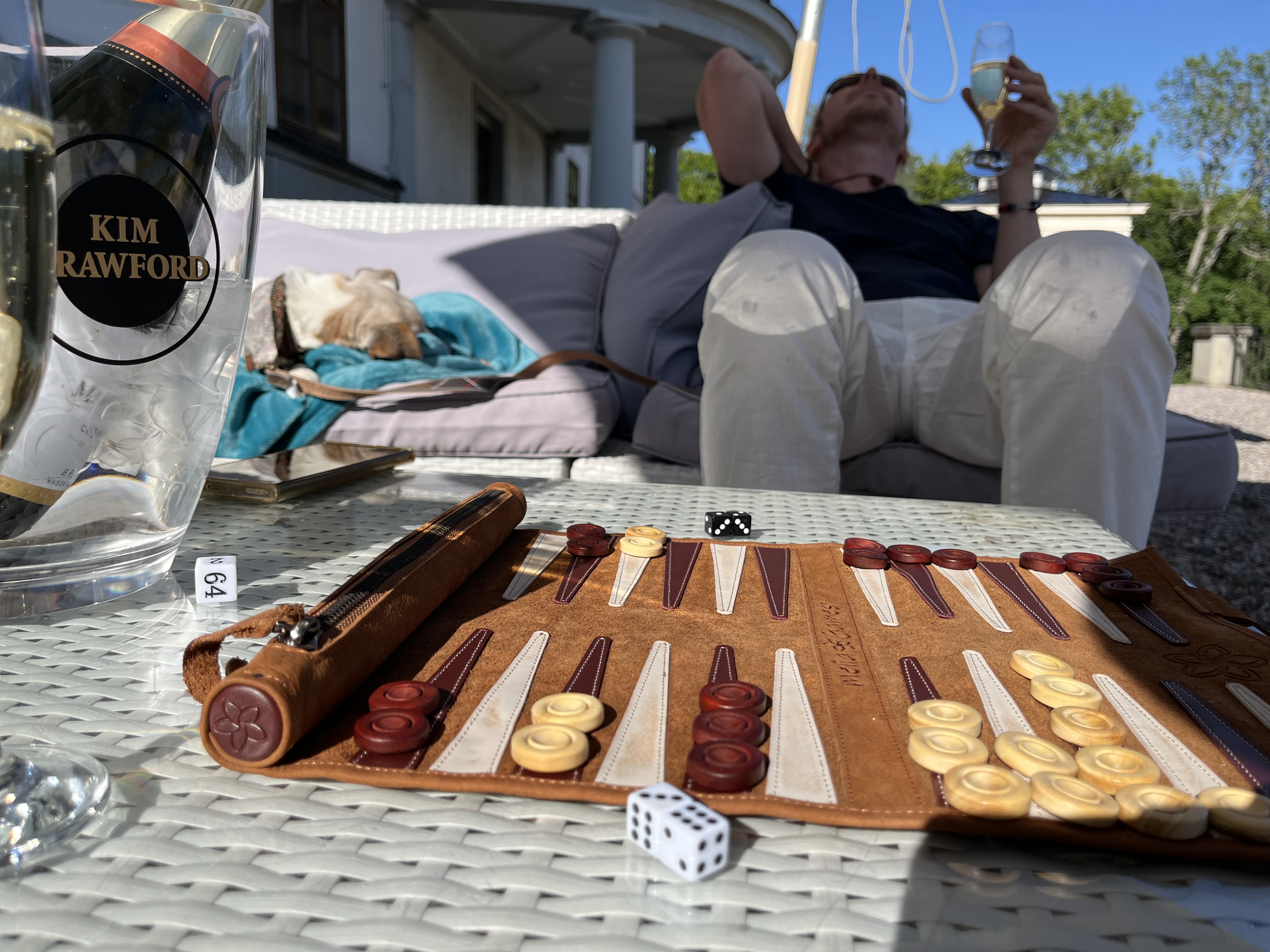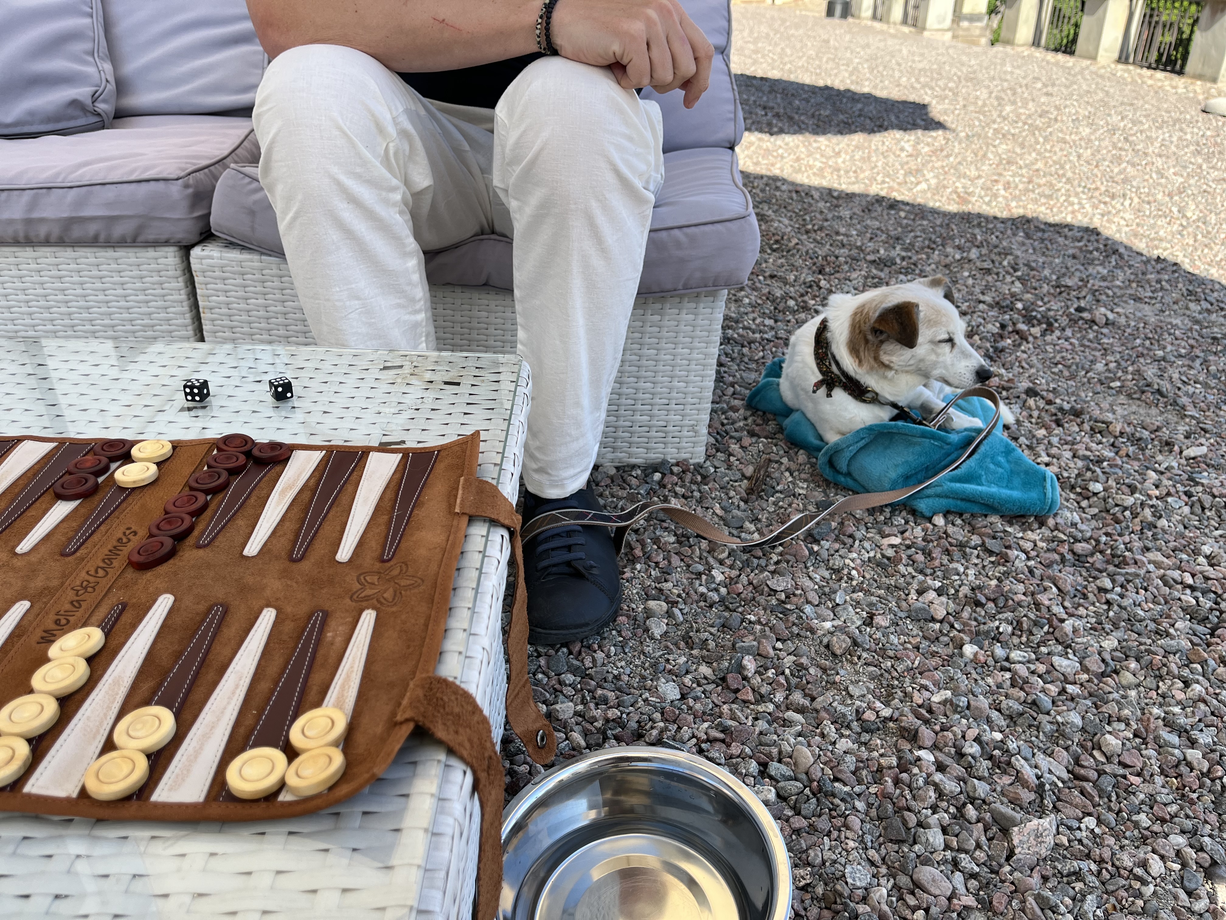 Vädret var soligt, varmt och härligt och vi bestämde oss för att ta med Gordon ut för att chilla på Slottsterassen och undersöka om vi kunde beställa något i Slottsbaren inne precis intill. Vi tog med oss Gordons hemmafilt, vårt Backgammonspel i resformat och gav oss först ut på ett slottsvarv för att rasta Gordon och gick sedan upp längs slottstrappan till slottsterassen för att sätta oss i en soffgrupp under ett svalkande parasoll med underbar utsikt över Slottsparken. Gordon chillade på sin filt och vi spelade spel och beställde drinkar från baren. Det var lugnt omkring oss och det blev en bra passivitetsträning för Gordon. Slottsterassen var underbar och när vi satt där hörde vi Tornseglare segla ner från slottstaket över oss och ut mot slottsparken och ge ifrån sig sina frihetsskrik.