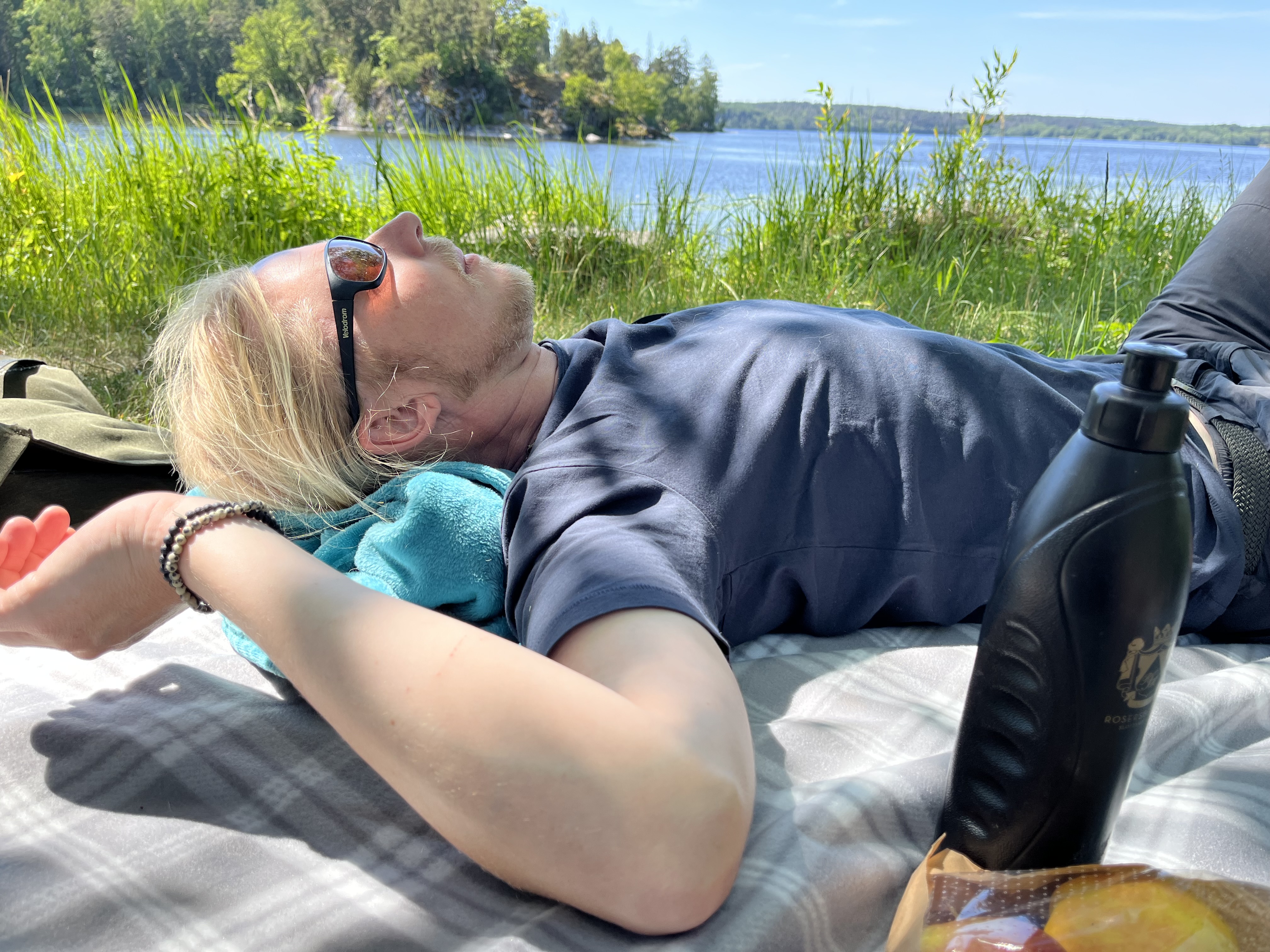 Vi valde till ett vandringspaket när vi bokade Rosersbergs Slottshotell och i det paketet ingick lån av ryggsäck som slottspersonalen packat med kaffetermosar, jättegoda baguetter och kakor, picknickfilt och flaskor med kallt gott vatten. Det blev en kort vandring nära vattnet med Gordon och vi bar honom ofta för att inte överanstränga Gordons nyopererade bakben. Det fanns en skogsallé med skugga som vi kunde valt, men av någon anledning blev det inte så och det var ett stort misstag för vi blev superdupervarma i solens hetta och försökte nå skugga så fort som möjligt och fann en härlig och vacker plats intill vattnet under en stor ek som gav skugga. Där bredde vi ut picknickfilten och hade en mysig picknick i det gröna med det som ryggsäcken bjöd på. Oj vad nöjda vi blev! Det var en härlig upplevelse! Vi njöt av den vackra utsikten, den svalkande skuggan under eken vid vattnet, det avkopplande fågelkvittret, den fräscha maten, de mumsiga kakorna och det goda kaffet. Ett stenkast bort från slottet ligger Mälarens strand med både brygga och badplats. Invid strandkanten kan du även hitta en knagglig stig till Kettils grotta.