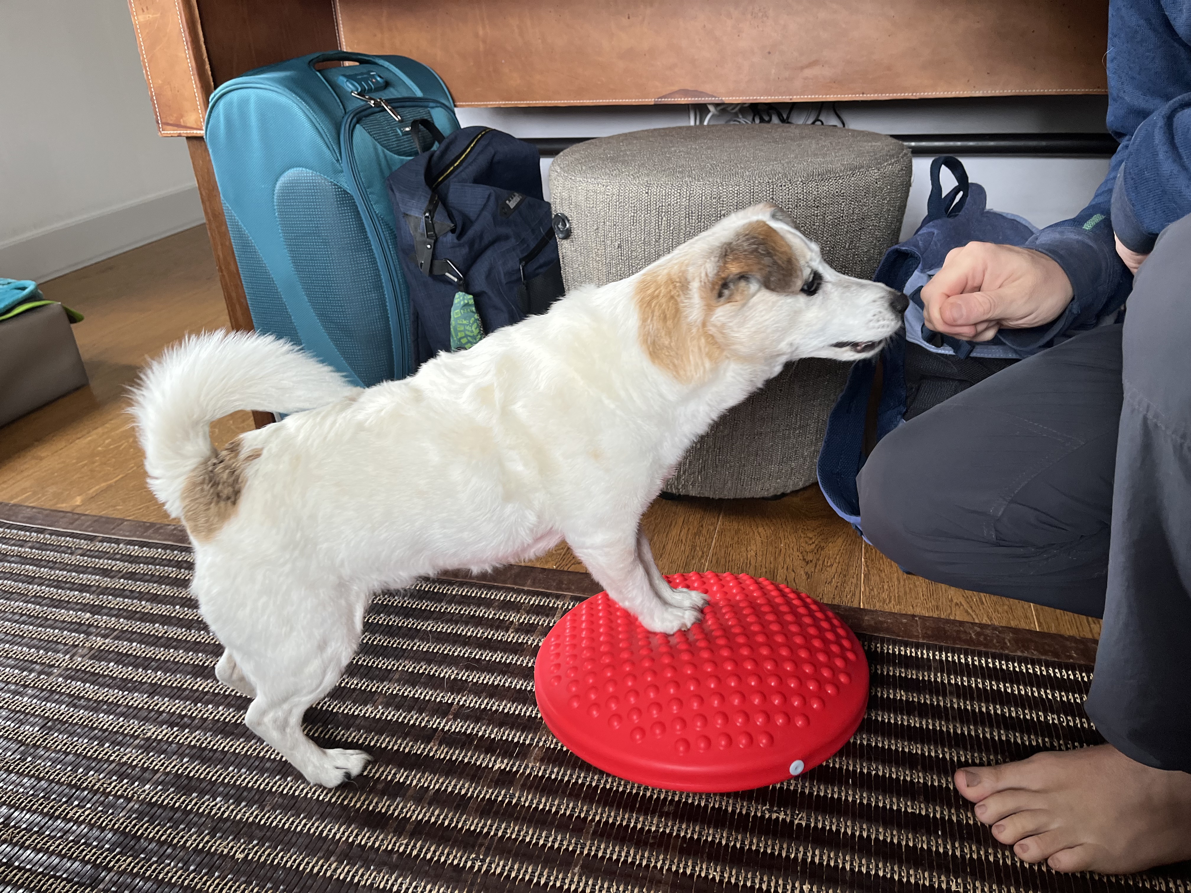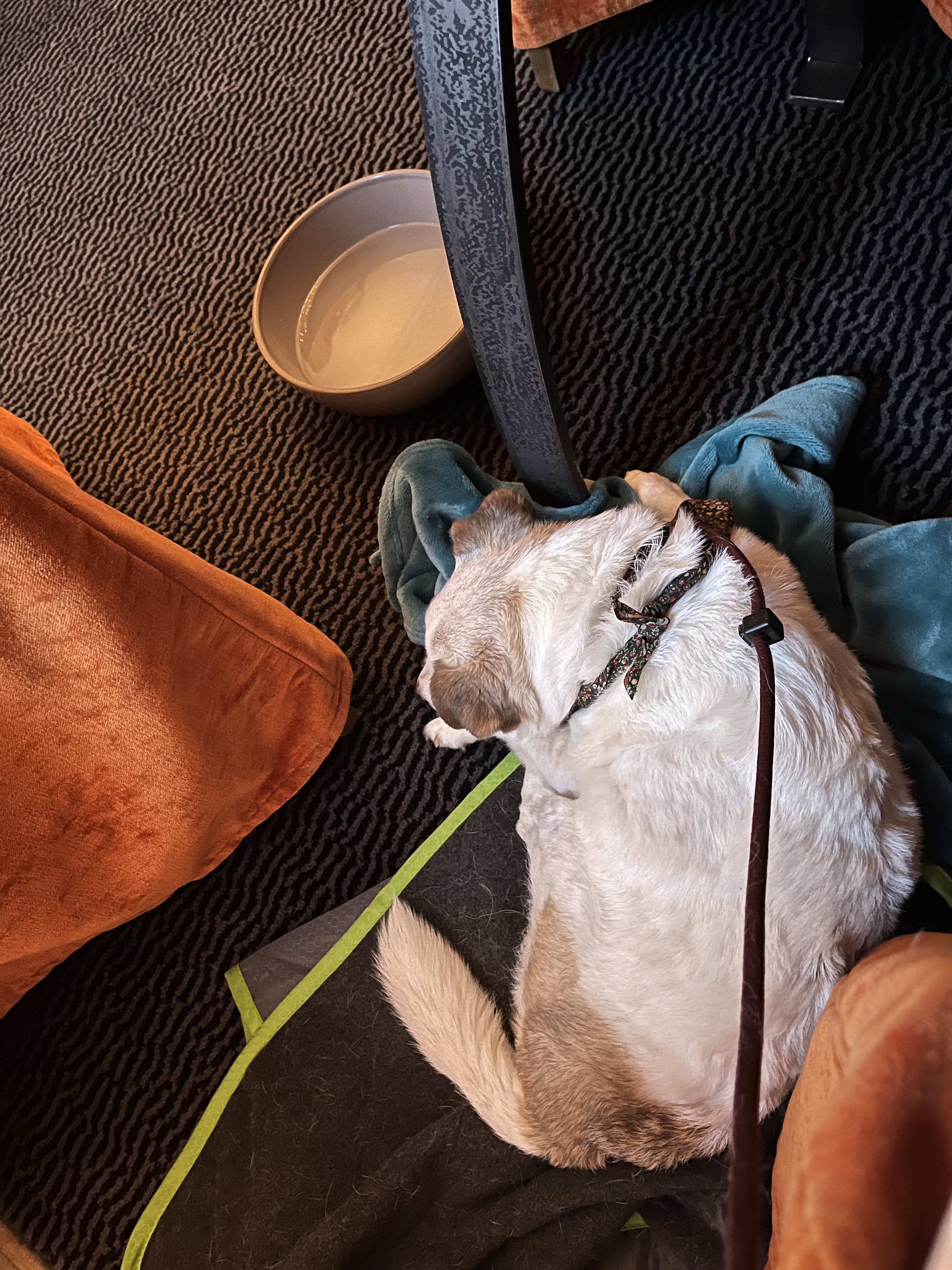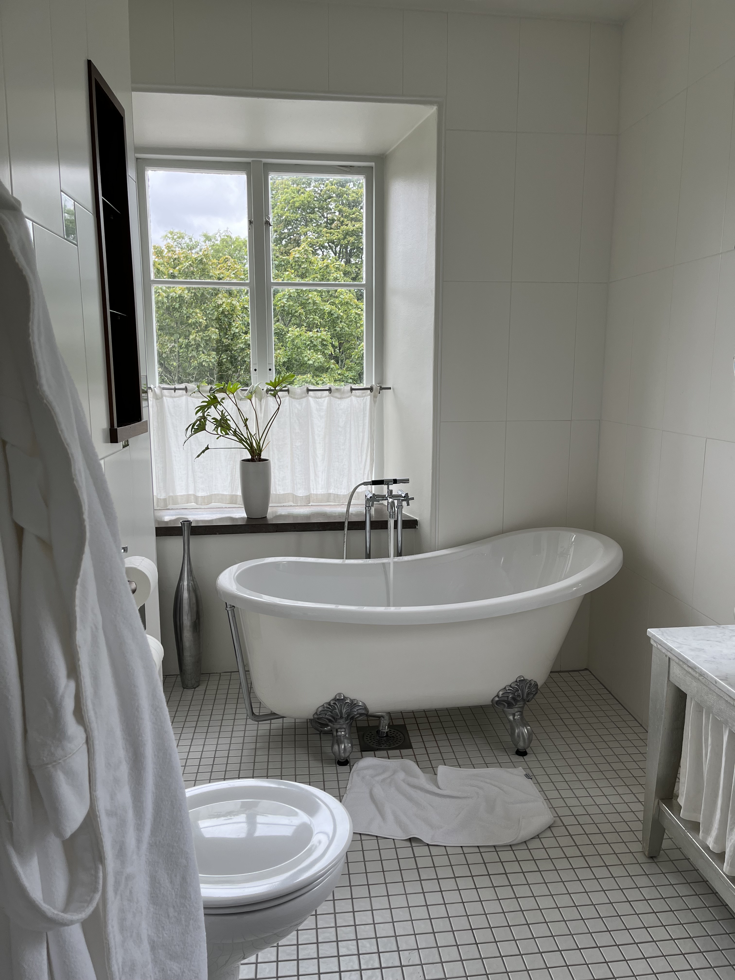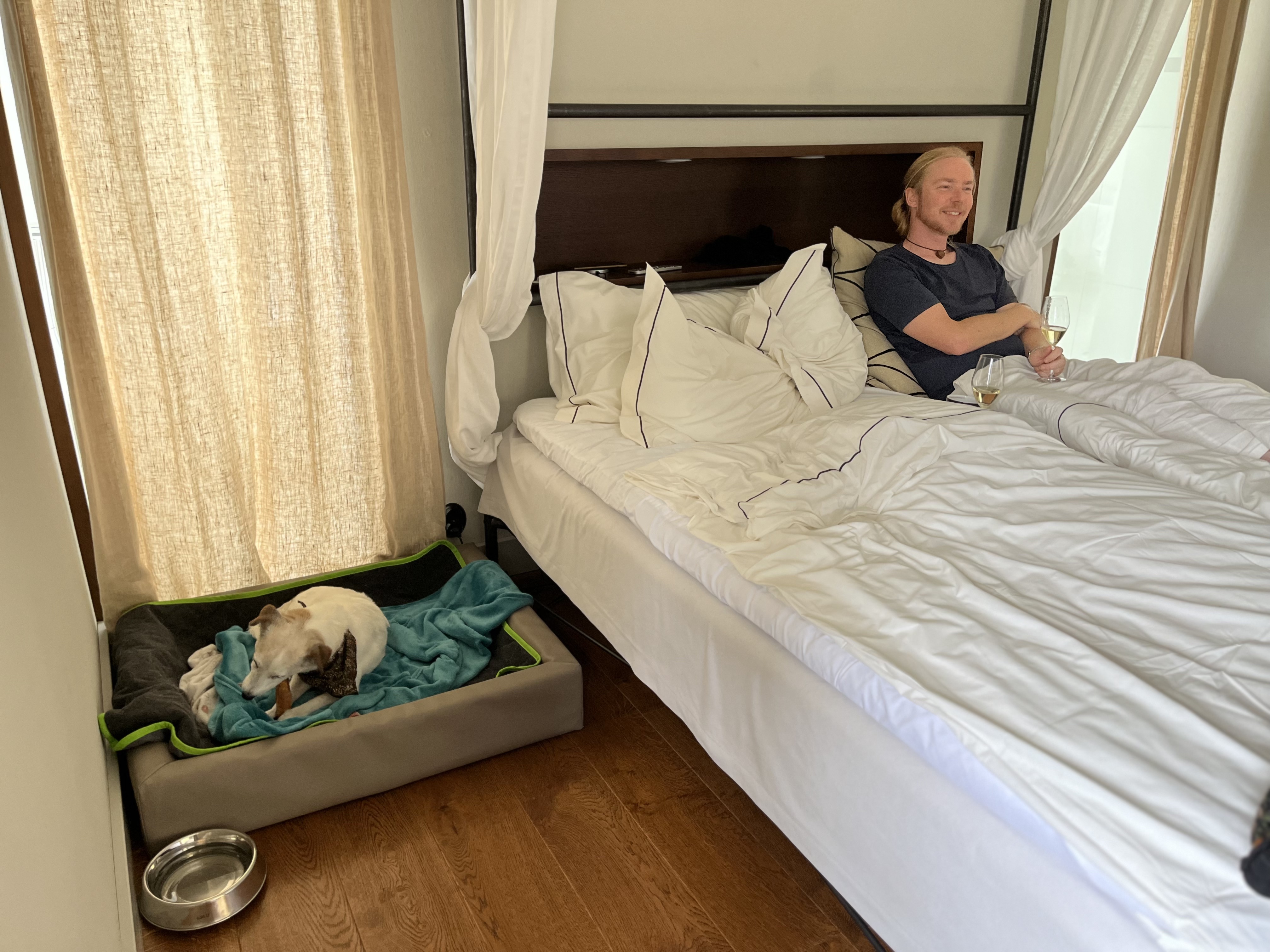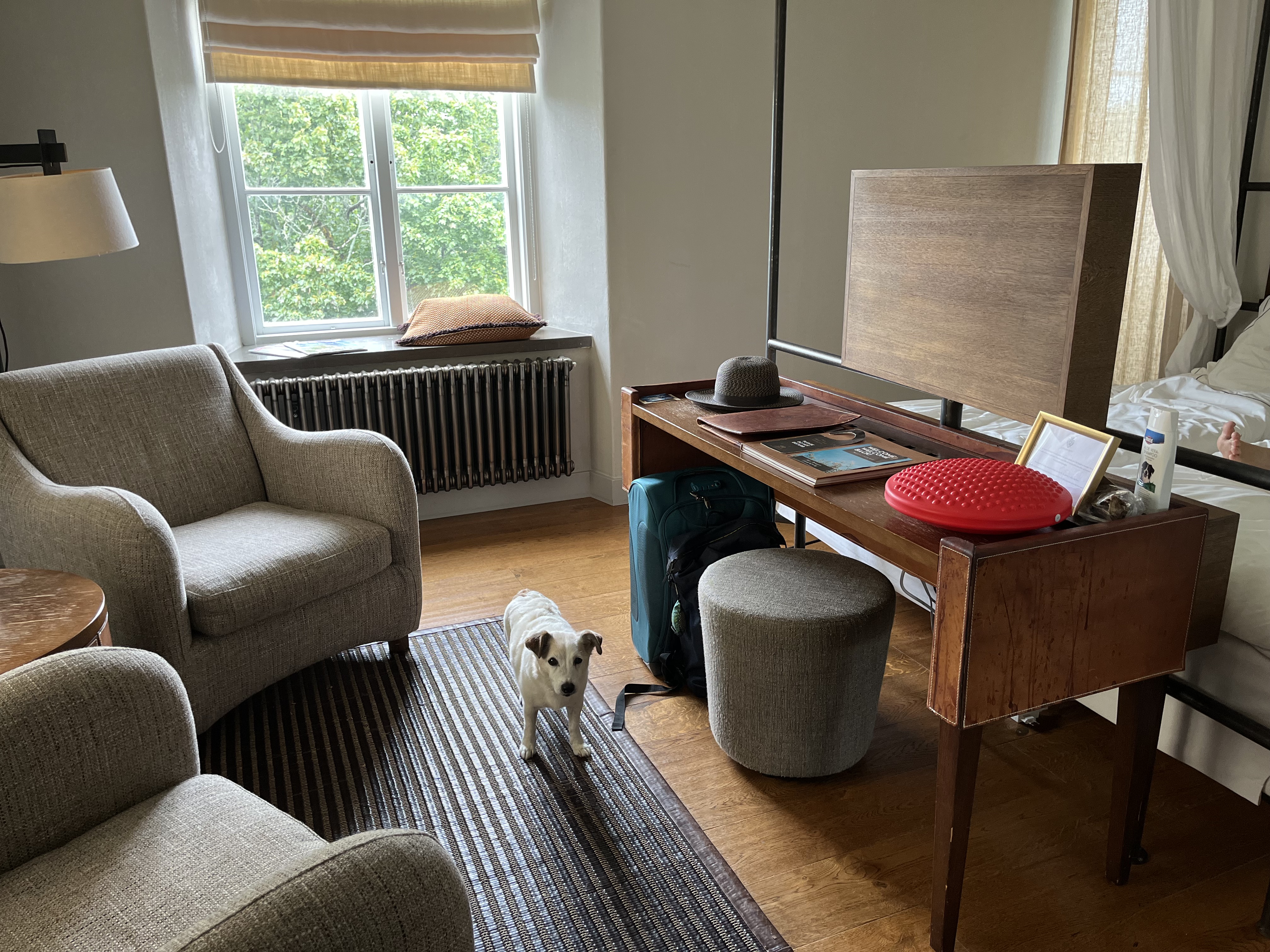Vi uppskattade särskilt mycket det stora fina lyxigt inredda rummet på slottet. Badrummet var stort och fräscht med både duschhörna och ett lyxigt badkar. Vädret var ostadigt under vår slottsvistelse och vi tillbringade mycket av tiden på rummet så det var extra skönt att rummet var stort och lyxigt. På rummet fanns omtänksamma detaljer såsom frottébadrockar, ett lyxigt kit från Rituals med både badskum, duschgel, schampo, conditioner, tvål och kroppslotion och ett vanitykit. Därför gjorde vi en egen liten spaupplevelse på rummet med bad i badkaret, och efteråt en svalkande och återfuktande ansiktsmask (som vi hade med oss hemifrån) och satte oss i fönstersmygen med öppna fönster och insöp den friska luften. Det fanns en generös minibar på rummet så vi lyxade till det och skålade i champagne och knaprade i oss lite goda snacks och flockhängde framför TVn. Vi rehabtränade Gordon med Gordons balansplatta (som vi hade tagit med oss) och motiverade honom i träningen med hundgodiset som vi fick i välkomstpaketet på rummet.