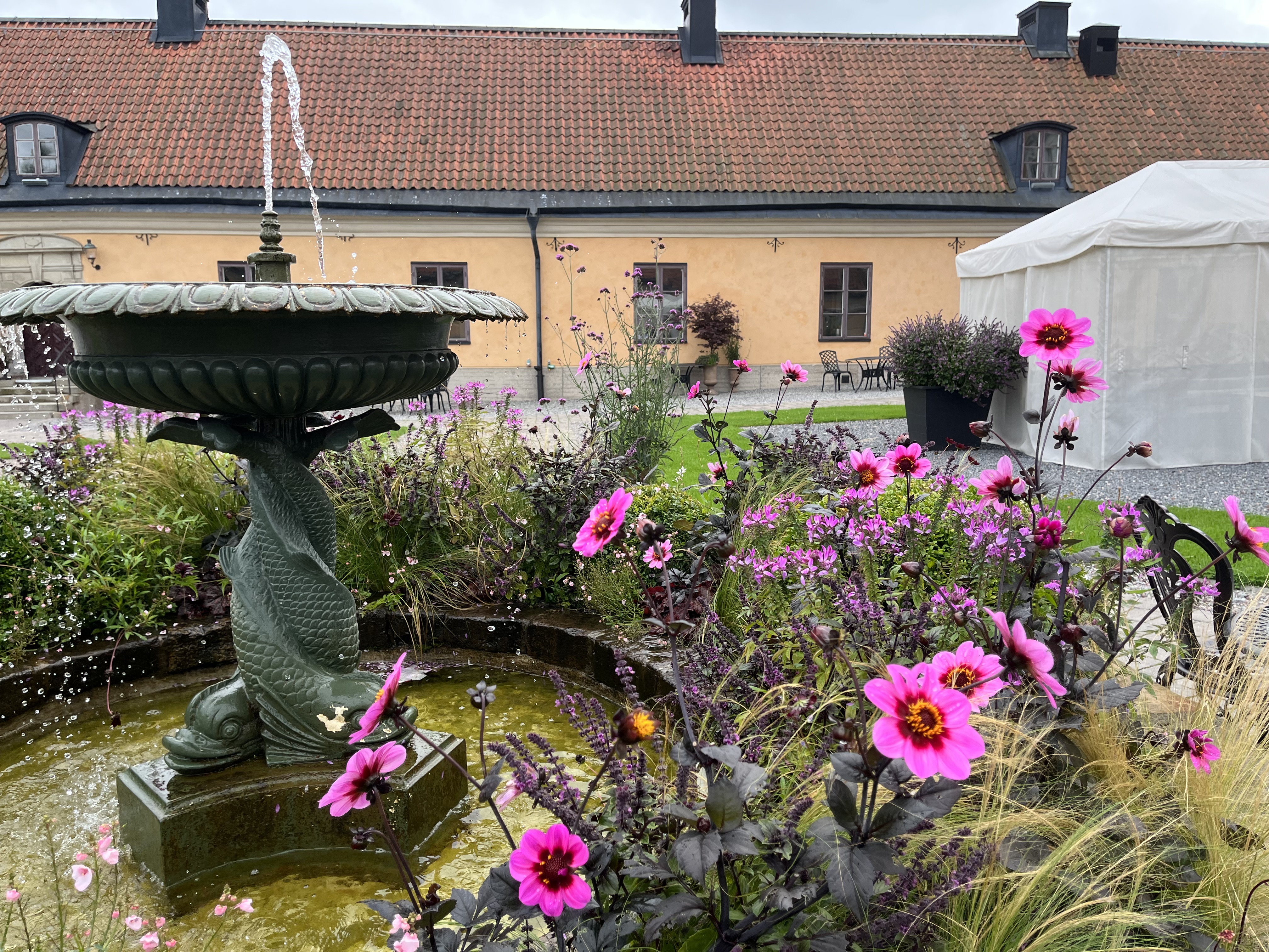 Vi promenerar mellan regnskurarna i den vackra slottsmiljön och finner inspiration till vår trädgård bland alla vackra blommor och trädgårdskonst i slottsträdgården. Vi rastar Gordon och följer några spännande dofter och strosar runt på Borggården framför slottet och njuter av vacker utsikt.