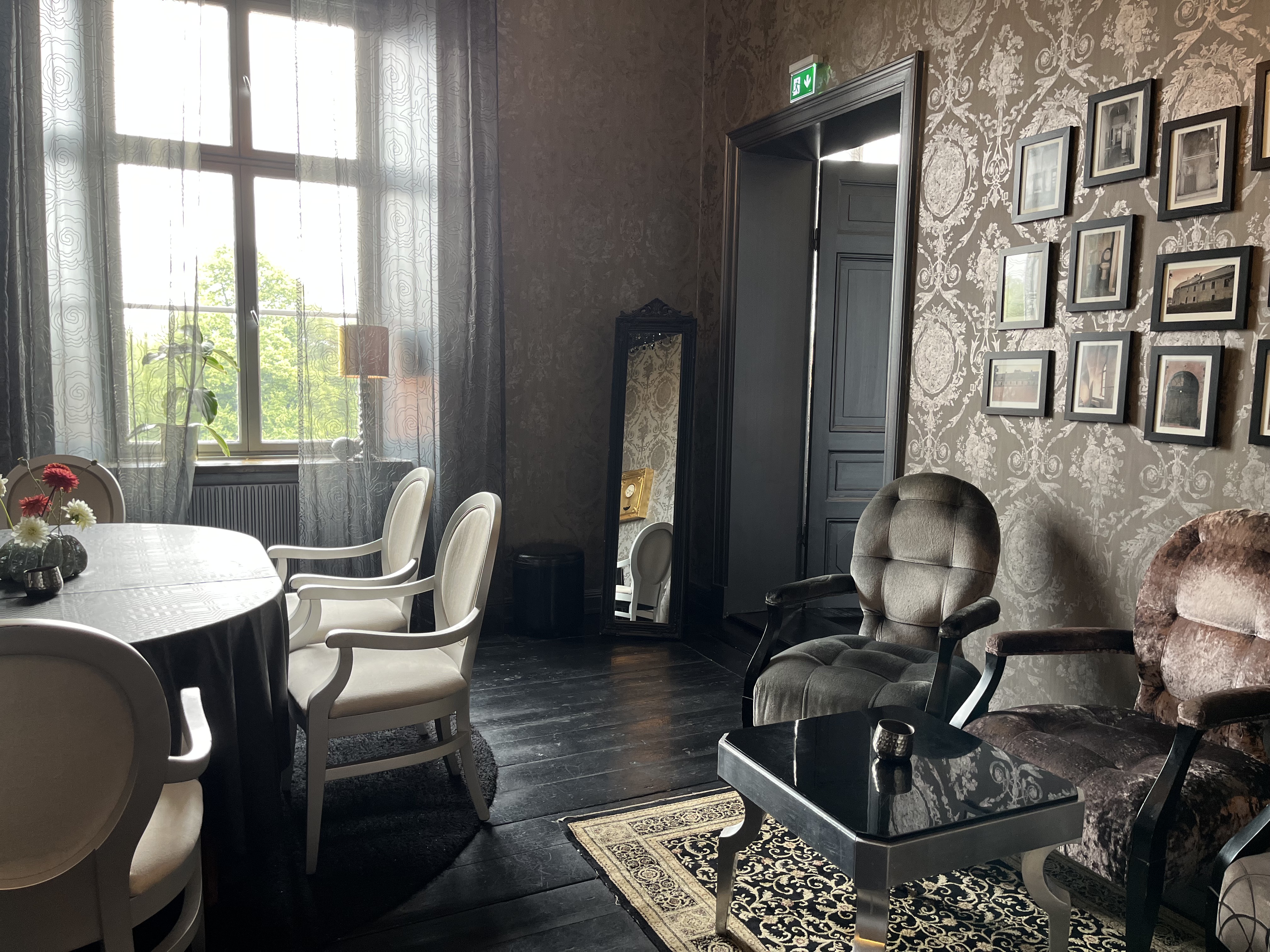 Efter konstutställningen letar vi rätt på de vackra slottssalongerna och frågar personalen om det går bra att vi tar en kaffe och slår oss ner en stund i loungemöblerna i den vackra slottsmiljön. Det var mysigt.