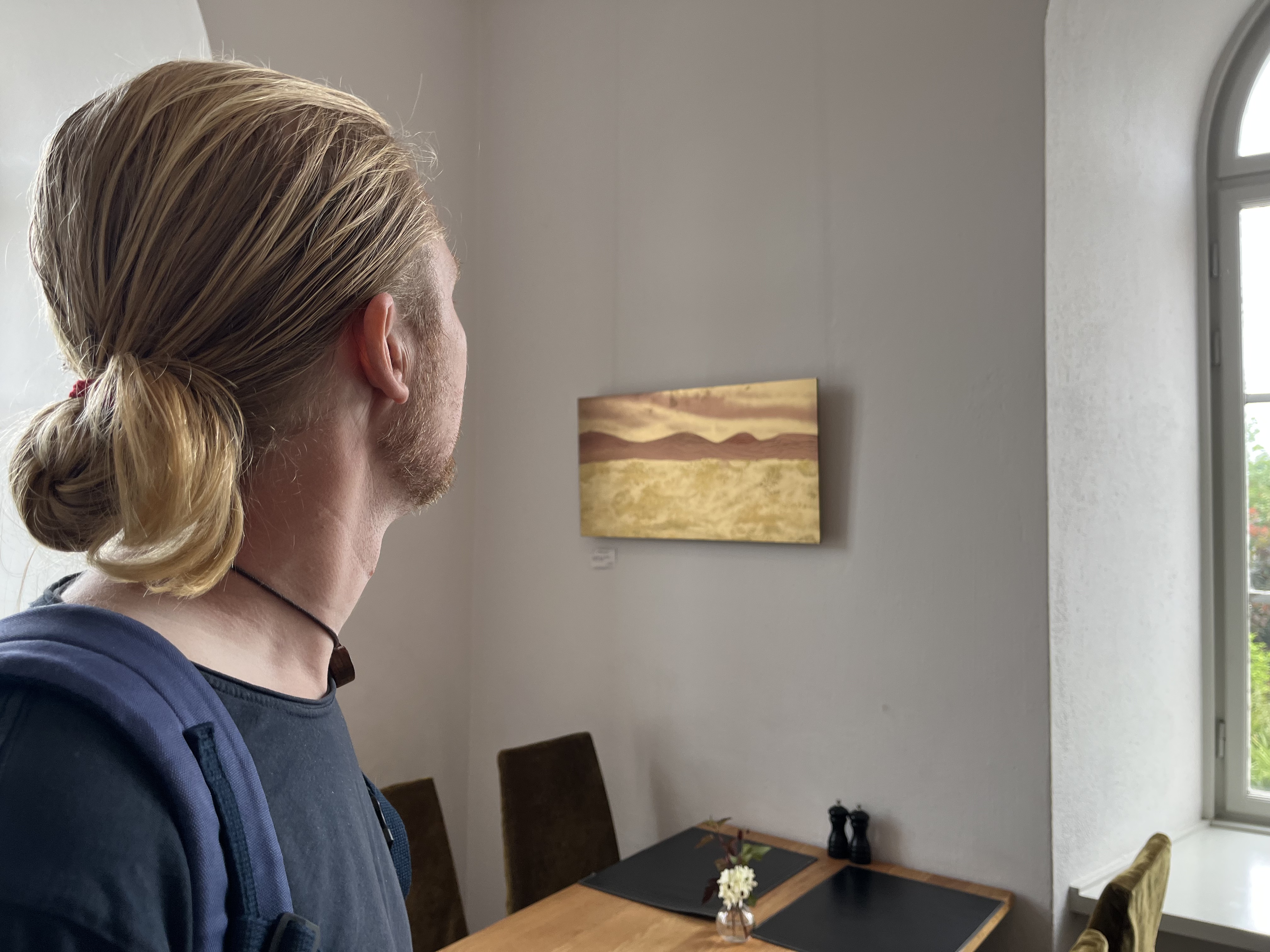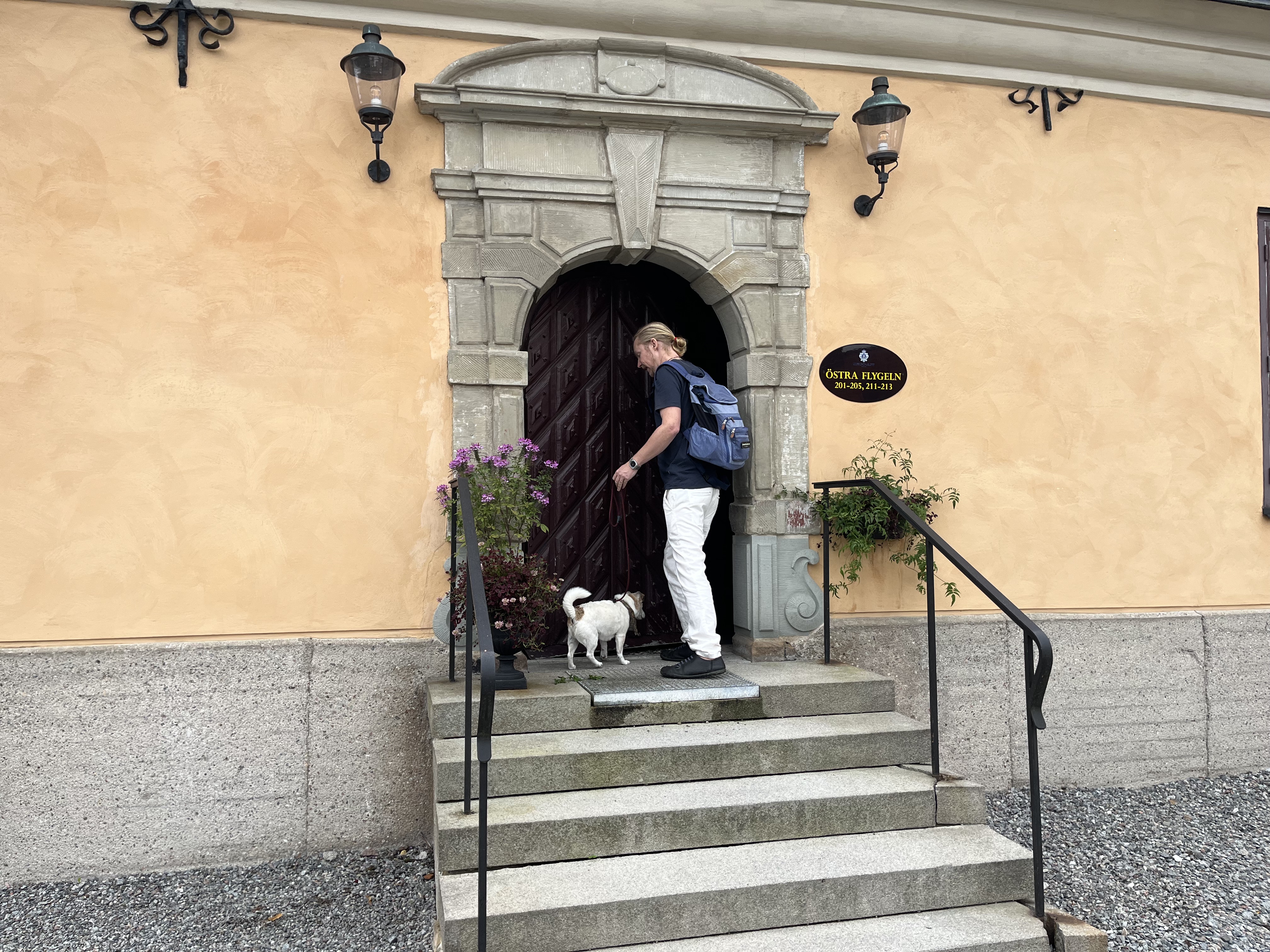 Eftersom Gordon befinner sig i en rehabprocess och har ett opererat ben som han snabbt blir trött i så tog vi det lugnt med promenader. Vi valde att utforska slottet och den närmaste omgivningen. Hade han varit starkare i benet hade vi kanske gått runt Lillsjön som låg nära slottet. Vi såg på Google Maps att det fanns ett utegym längs promenadstigen runt Lillsjön och det hade vi nog också använt om vi gått runt sjön med Gordon. Kanske hade vi även gått över bron till Ulvsunda strand om vi hade haft en frisk och stark hund, men det får vänta tills nästa gång vi besöker slottet. Vi läste på slottets hemsida att det fanns en intressant konstutställning i slottets restaurang. Vi gick dit med Gordon och tittade på konstutställningen som hette “Walk of Life” (konstnärer: Ninni Ahlsell & Joe Skovbye).