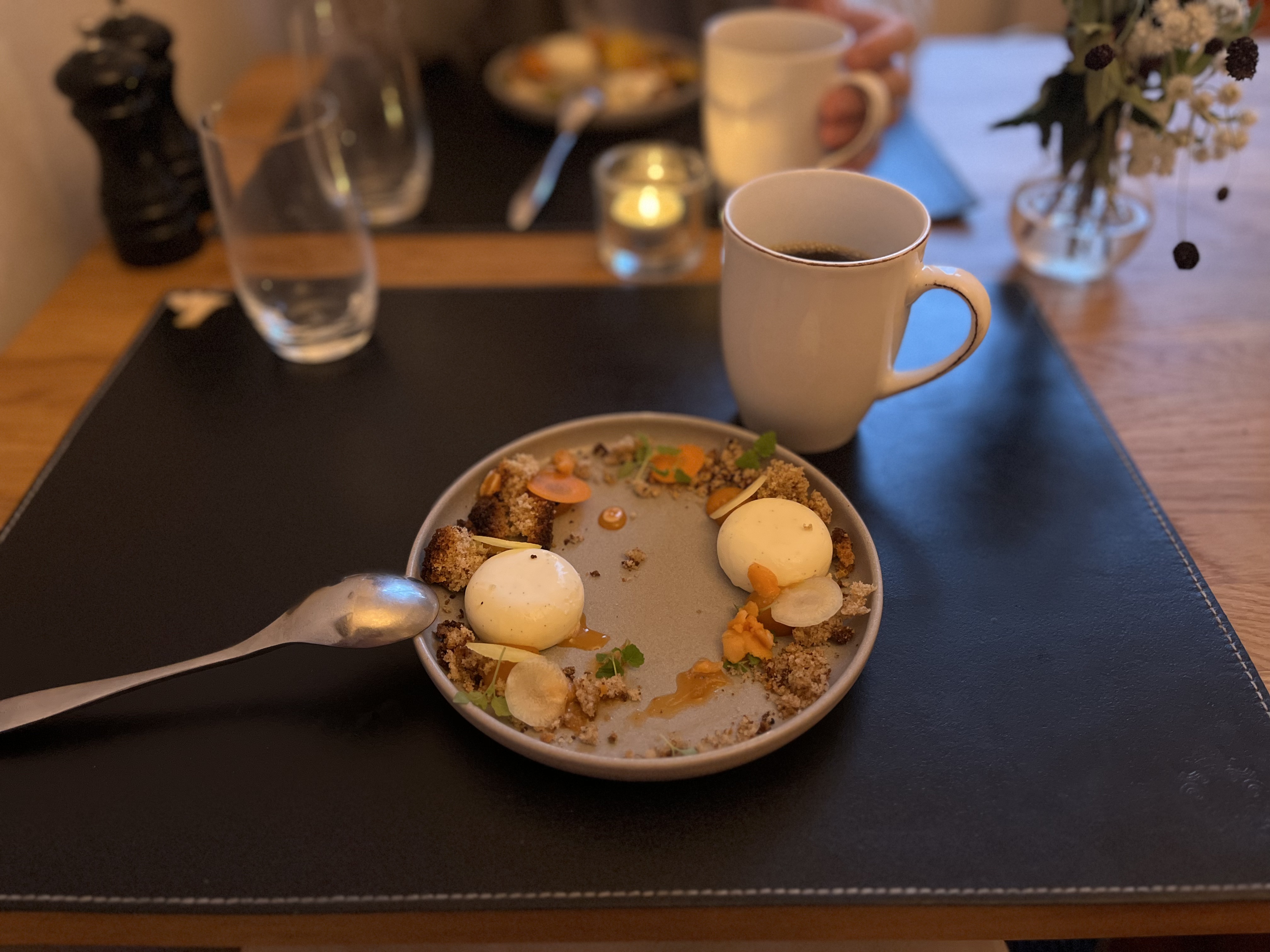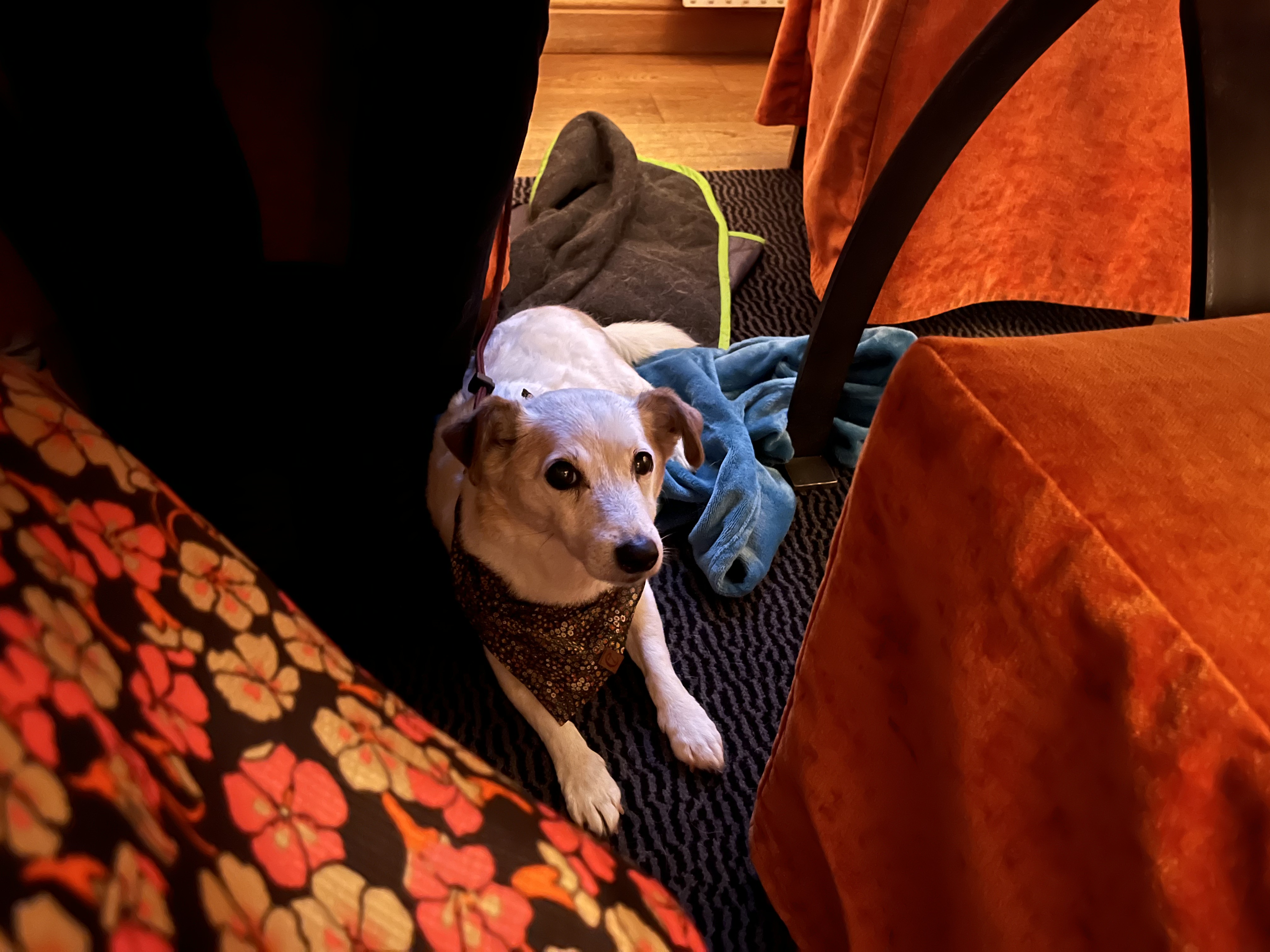 Som hundägare är man väldigt tacksam när man får ta med hunden vid måltiderna då det innebär en väldig avkoppling att slippa behöva oroa sig för att hunden ska bli stressad av att vara ensam i en ny miljö på rummet när man sitter och äter middag eller frukost i restaurangen. Vi kunde njuta av den härliga champagneupplevelsen i en slottssal, en 4-rätters middag och en härlig frukost tillsammans med Gordon och kände oss mycket nöjda och glada åt detta.