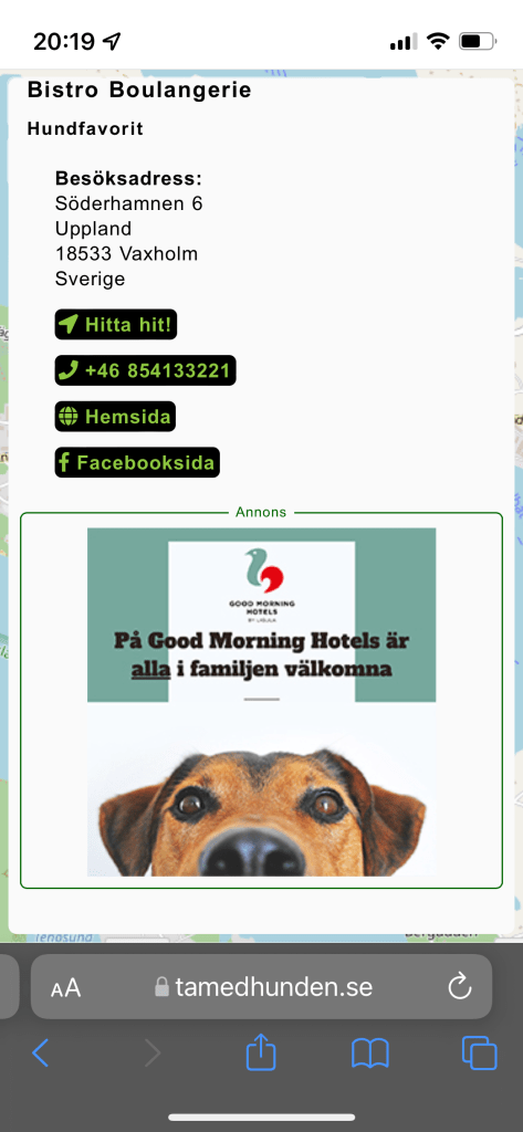 Veronica can help you with brand visibility, ads and dog friendly offers on the start screen or at listed establishment’s info pages in the apps tamedhunden and bringthedog in the dog friendly guide? The apps “bringthedog” and “tamedhunden” had over 111 thousands unique users and 1.5 million page views during 2022. Veronica can help you with both ad design, visibility and to help you gain traffic to your own site in order for users to do bookings or buy your products or services. Please send an email to Veronica and she will get back to you with recommendations of visibility pakages and help you out with ideas, info and answers to your questions: veronica@tamedhunden.se